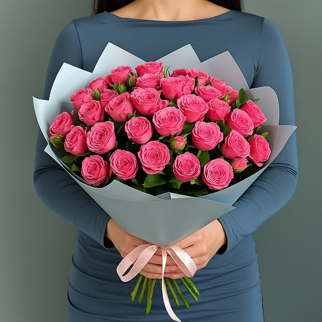 Эффектный и стильный букет с насыщенными розовыми кустовыми розами — идеальный выбор для признания в любви, поздравления или сюрприза. Роскошные пионовидные бутоны дарят атмосферу нежности и праздника, поднимая настроение с первого взгляда.