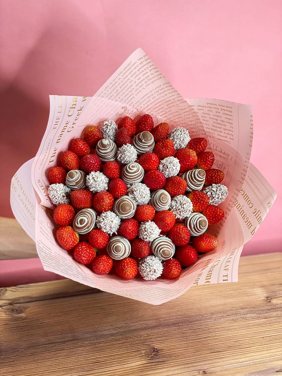 Очень качественный букет,жена в восторге. Шоколад настоящий, суперская клубника. Заказывал к 8 марта, отличная служба доставки. Однозначно рекомендую!