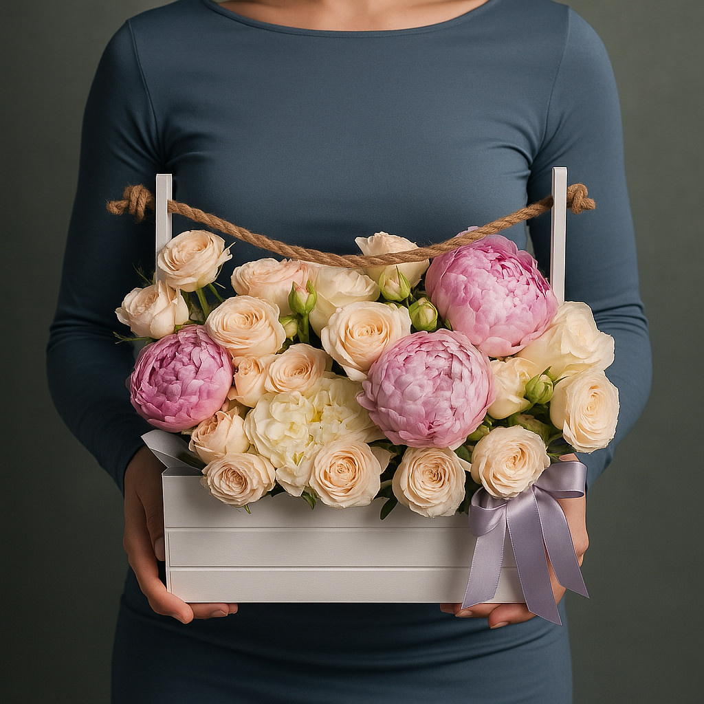 Роскошная композиция в деревянном ящичке с пионовидными розами и нежной зеленью станет эффектным акцентом любого торжества.